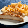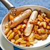 (2 Wurstel con salsa ai funghi e patate fritte)